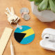The flag of the Bahamas features a black equilateral triangle on the left representing the unity and determination of the people of the Bahamas. The triangle is oriented toward three equal-width stripes symbolizing areas of natural resource; two aquamarine stripes at the top and bottom of the flag representing the sea and one gold stripe representing the land. The flag was adopted on July 10, 1973.