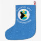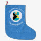 Blonde haired angel dressed in the flag of the Bahamas flies Inside of a white circle of squiggly squares on this large Christmas Stocking. The background is blue squiggly squares. The white and blue colours were chosen to represent Hanukkah. Design created for families of multiple religions. Add a name to personalize. Add a year to customize. Or, change the text to whatever you wish.