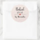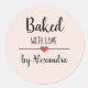 Modern "baked with love" sticker with a black font on a blush pink background embellished by a cute red heart. Customize text.
