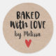 Personalize this large 3 inch baked with love sticker with your name. Perfect for that finishing touch to your homemade gifts from the kitchen. Designed for you by Blackberry Boulevard