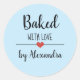 Modern "baked with love" sticker with a black font on a light blue background embellished by a cute red heart. Customize text.