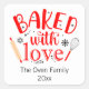 A Baked With Love Holiday square sticker with a red, whisk, and snowflakes modern design.