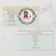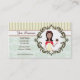 The Baker or Pastry Chef Business Card is a customizable business card with a feminine touch. Perfect to use for a personal business or a business with a physical location. This card can be customized to use for your needs. The illustration features a baker/pastry chef with a yellow apron with hearts on it, a red dress with polka dots, a red head band, and a large cupcake with chocolate frosting designed exclusively by © Cicely James for CiJa Studio. The front background is a pink damask bottom with a yellow and green striped top. The back has a list of menu items and website information for business promotion. The writing is a script font in a feminine chocolate colour. Perfect for a professional look with a feminine touch.. Use the personalize feature to the right of the business card demo if you love the font style, colouring and size to just change the demonstration information. If you want to add more text boxes, change the font colour, sizing or style--- click on the orange "customize it" button below the business card demo to change things to suit your personal tastes.