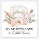 Watercolor baker pastry chef business card featuring a name and title banner and bakers tools\ and chef hat with floral touches and a gold border. Whimsical illustrative style.