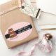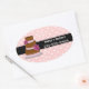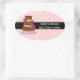 Lovely large oval sticker done in a whimsical white on pink polka dot, with a black stripe going across the centre, for text. A whimsical chocolate and pink wedding cake decorates the left side of the sticker. Personalize the text for your business needs. Great on cake and baked good boxes.