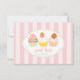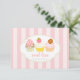 Light pink stripes pattern on the background. It features a retro white label and three cupcake illustrations (frosting, strawberry, cookies). Cute, light, sophisticated for your bakery, café or sweet shoppe. Some elements by Tic Tock Shop.