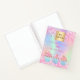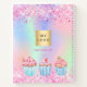 A trendy holographic, iridescent background in pink, purple, rose gold, mint green. Decorated with faux glitter dust in pink and 3 cupcakes. Personalize and add your business logo, text, year and name. The personal name is written with a modern hand lettered style script.