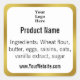 A display image is at the top to replace with your logo. Display text is under the image. You can edit the text to show the product name, a list of ingredients, your website, or a custom message. The sticker is white with a faux (not foil) gold border. The text is black.
