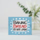 "Baking Bread Is My Jam" is a cute text design in blue with black and red text, along with a white accent shape and white textured whimsical dots surrounding it.