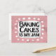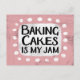 "Baking Cakes Is My Jam" is a cute text design in pink with black text, along with a white accent shape and white textured whimsical dots surrounding it.