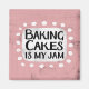 "Baking Cakes Is My Jam" is a cute text design in pink with black text, along with a white accent shape and white textured whimsical dots surrounding it.
