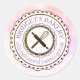 Rolling pin and kitchen whisk baking utensils on a fancy emblem with netting and watercolor splash background on this home bakery "homemade with love" sticker or "from the kitchen of" label for your delish baked goods.