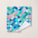 Serviette sertie dans un motif d'écailles de sirène d'imaginaire, dans des couleurs d'aqua inspirées du verre de mer, rose coquille, turquoise, vert de mer et bleu cobalt