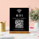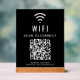 Panneau acrylique noir moderne pour permettre à vos clients, clients ou invités de se connecter facilement à votre réseau wifi. Téléchargez le code QR de votre wifi et ajoutez d'autres détails, tels que le nom et le mot de passe du réseau, dans une simple typographie blanche. Parfait pour les bureaux, les hôtels, les locations de vacances, etc.