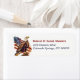This patriotic return address label features a proud bald eagle perched in front of a slightly distressed USA flag. Your info is in red and dark navy blue at the right of the image. Everything is placed on a crisp white background.