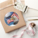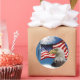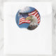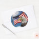 Shown is an image of the U.S. flag and a proud profile of a bald eagle.