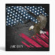 Landing bald eagle on American flag graphic on black rock background.