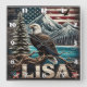 A majestic bald eagle rests on a branch, surrounded by towering mountains and lush trees, set against a vibrant backdrop of the American flag.