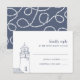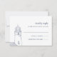 La carte RSVP de style côtier romantique comporte la date de réponse souhaitée et le libellé d'acceptation/de déclin personnalisé en bleu marine, ainsi qu'une illustration de phare nautique dessinée à la main de style vintage. Les cartes s'inversent sur un motif à corde blanche sur le bleu du port.