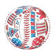 Un baseball avec couture rouge et des motifs patriotiques, avec étoiles, rayures, tambour, casquette de fête, lunettes de soleil et notes musicales, le tout en rouge, blanc et bleu.