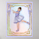 Pretty design is perfect for little girl who loves to dance. It features a ballerina child dancing in pastel purple outfit and pink flowers in her hair. Background is soft pink, aqua and purple blend with gold trim accent. Would make a perfect addition to a child's room.