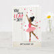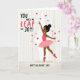 This greeting card shows a ballerina with dark skin standing center stage in front of a softly draped curtain. She wears a bright fuchsia leotard with a light pink tutu and balances on pointe, smiling with one arm reaching up. Deep pink hearts float around her, adding a sweet Valentine’s Day feel ❤️. On the left side, the card reads “YOU MAKE ME LEAP FOR JOY!” in a hand-drawn script style, and “LEAP FOR JOY!” stands out a bit more than the rest. Near the bottom, there’s also a “Valentine’s Day” message in simple lettering that helps set the occasion. The background uses warm cream tones with pink accents, giving the scene a cozy theater setting 💌. It feels like a happy little performance meant to celebrate affection and friendship 🍫.