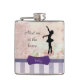 A personalized flask with the words: "Meet me at the barre". Designed with a silhouette of a ballerina on a pretty background. This elegant ballet dancer is standing on her toes, en pointe with her arms outstretched gracefully.