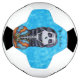 Ce ballon de football a une dame souriante du squelette Day of the Dead avec de longs cheveux noirs portant une cape orange et bleue tenant un bouquet de fleurs blanches sur un arrière - plan bleu aqua à motifs. Customisez votre texte avec le modèle.