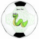 Ce ballon de football a un serpent amusant avec de grands yeux blancs qui est vert vif et jaune sur un arrière - plan blanc avec des pois verts. Customisez votre texte avec le modèle.