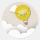 Un autocollant illustrant l'illustration d'une montgolfière jaune flottant au-dessus des nuages avec un arrière - plan de coup de soleil. Personnalisez le texte. Des invitations à des fêtes d'anniversaire sont disponibles à Jill's Paperie.