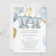 Cette adorable invitation au baptême présente des éléphants garçons bleus et gris avec ballons, confettis et croix d'or. L'arrière est habillé d'une aquarelle bleue douce. Customisez facilement à votre événement en cliquant sur "Personnaliser".