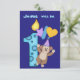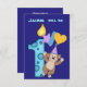 C'est un design coloré d'invitation à la fête d'anniversaire, avec une polka turquoise et bleue pointillée numéro un image de bougie, et un mignon singe brun dans un casquette d'anniversaire et tenant des ballons devant lui. Le haut de l'invitation dit (Nom) sera (un). L'image et le texte sont placés sur un arrière - plan violet brillant. Le dos de la carte est le même violet, avec vos informations de fête en blanc. Merveilleux pour la première fête d'anniversaire de votre enfant! *Merci à Real Deal Clipart pour le clipart utilisé pour créer ce design.