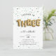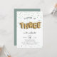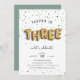 Adorable party invitation's for your little one's third birthday feature "THREE" spelled out in gold balloons, on a background of sage green confetti. Personalize with your third birthday party details in a combo of whimsical and modern lettering. Invitations reverse to solid dusty sage green.