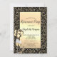 Elegant gold swirls, balloons, wine glasses, gold glitter high heels on black background.