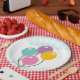 A bright and fun paper plate for a birthday party, with purple, yellow, pink and green balloons floating in the clouds, on a light blue starburst background.