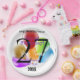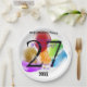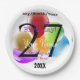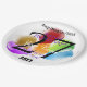 Paper plates, personalized for a birthday with balloons as background. Day, month, year, "Happy Birthday!", name, "wishing you the best", and the year. Coordinating giant gift card, paper cups, paper plates, paper napkins, gift wrap and other items sold separately. Designed by HAMbyWhiteGlove