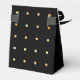 Front : Elégant et moderne merci ballotin pour une fête de 50e anniversaire. Fond noir et texte faux or écrit avec un script de style à la main tendance : bonjour cinquante. Avec des points dorés comme décor. Modèles pour un nom, lettre d'or. Avec le texte : Merci. Dos : points dorés sur un arrière - plan noir.