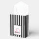 Un ballotin pour une fête du 90e anniversaire. Bandes verticales noires et blanches classiques en arrière - plan. Avec des fleurs roses girly et féminines, roses comme décoration. Avec le texte : Merci ! Un cadre blanc et noir sur le devant avec modèle pour l'âge, le nom et la date. Numéro d'âge 90 en rose, nom et date en noir. Le nom est écrit avec un script de style écrit à la main.