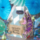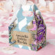 Cette boîte cadeau fantaisiste présente un Alice coloré au Wonderland conte de fées par tea party thème. Une image du Cheshire Cat est photographiée sur un côté de la boîte, accentuée d'une parties scintillant en or. Le casquette de Mad Hatter et une pile de tasses sont placés de l'autre côté. L'arrière - plan dispose d'un motif arlequin bleu pâle.
