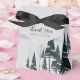 Une scène hivernale charmante d'une forêt enneigée de sapins et d'épicéas vert foncé et un ciel gris pâle décore cette boîte de faveur de fête de vacances pour un mariage ou un gala de Noël. Ce dessin moderne d'un paysage naturel enneigé est parfait pour une soirée de décembre ou janvier.