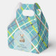 Célébrez dans le style avec ce charmant ballotin de douche pour bébé avec un ours en peluche doux orné d'un ruban bleu doux, niché dans un design d'arc ludique. L'avant présente une arrière - plan fraîche, bleu turquoise, revêtue d'un parfum vert citron, blanc et orange pour une touche moderne sur une motif classique.