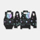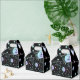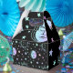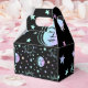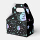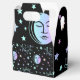 Boîte à cadeaux ou ballotin au design céleste avec soleils, lunes et étoiles aux couleurs pastel sur un arrière - plan noir.
