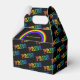 Ce ballotin a un arrière - plan noir avec le mot "PRIDE" dans les couleurs arc-en-ciel, formant un motif. Sur le côté avant de la boîte, il y a un panneau noir avec un arc-en-ciel et une zone pour ajouter du texte personnalisé.