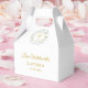 Élégante boîte de faveur de baptême ou de christening florale avec une jolie couronne de laurier et une croix dorée avec les détails de votre événement dans une typographie dorée chic. Vous pouvez personnaliser avec votre propre message de remerciement au verso. Un moyen parfait de dire merci à vos invités ! Conçu par Thisisnotme©