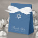 Un ballotin bleu classique pour la mitzvah d'un bar garçon. Sur le rabat, il a une fausse étoile d'argent de David. Le message Merci est écrit dans la partie inférieure, dans un élégant faux script argent, l'occasion et la date sont écrits en casquette gris sous elle. L'arrière - plan est bleu classique.