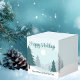 Un beau paysage hivernal avec des pins verts sarcelle et un sol enneigé sur une petite boîte de fête de vacances personnalisée. Personnalisez ce chocolat Joyuses Fêtes d'entreprise pour vos clients ou employés.