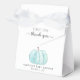 Jolie boîte de faveur bébé garçon douche avec "merci" en typographie gris simple et un script élégant avec des swashes et une aquarelle d'un citrouille bleu.