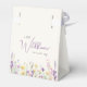 Ballotins taupe légers pour votre douche bébé fille avec "merci" et "un petit fleur sauvage est en route" en typographie gris clair et un script violet lavande élégant et aquarelles d'inspiration boho de fleurs sauvages violet, rose et jaune. Personnalisez le nom et la date de la douche de la mère en lettres simples violet lavande et gris.