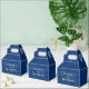 Carte du monde bleu foncé et jaune rond boîte de faveur de mariage pour un mariage de destination.
