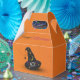 Illustration Halloween joyeuse avec un casquette sorcier aux étoiles dorées et la lune et une araignée suspendue sur un arrière - plan orange aux formes de motif jack-o-lanterne.